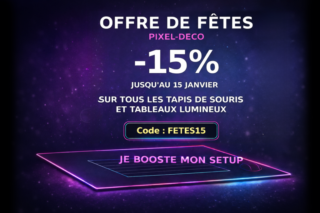 Tu peux commencer petit, avec un tapis de souris qui remplace ton vieux modèle basique, ou directement refaire l’ambiance de ton bureau avec un combo tapis + tableau lumineux. À toi de choisir ce qui correspond le mieux à ton style et à ton budget. L’essentiel, c’est que chaque élément que tu ajoutes à ton setup ait un vrai impact : sur ton confort de jeu, sur ta précision, et sur le plaisir que tu as à t’installer devant ton écran.